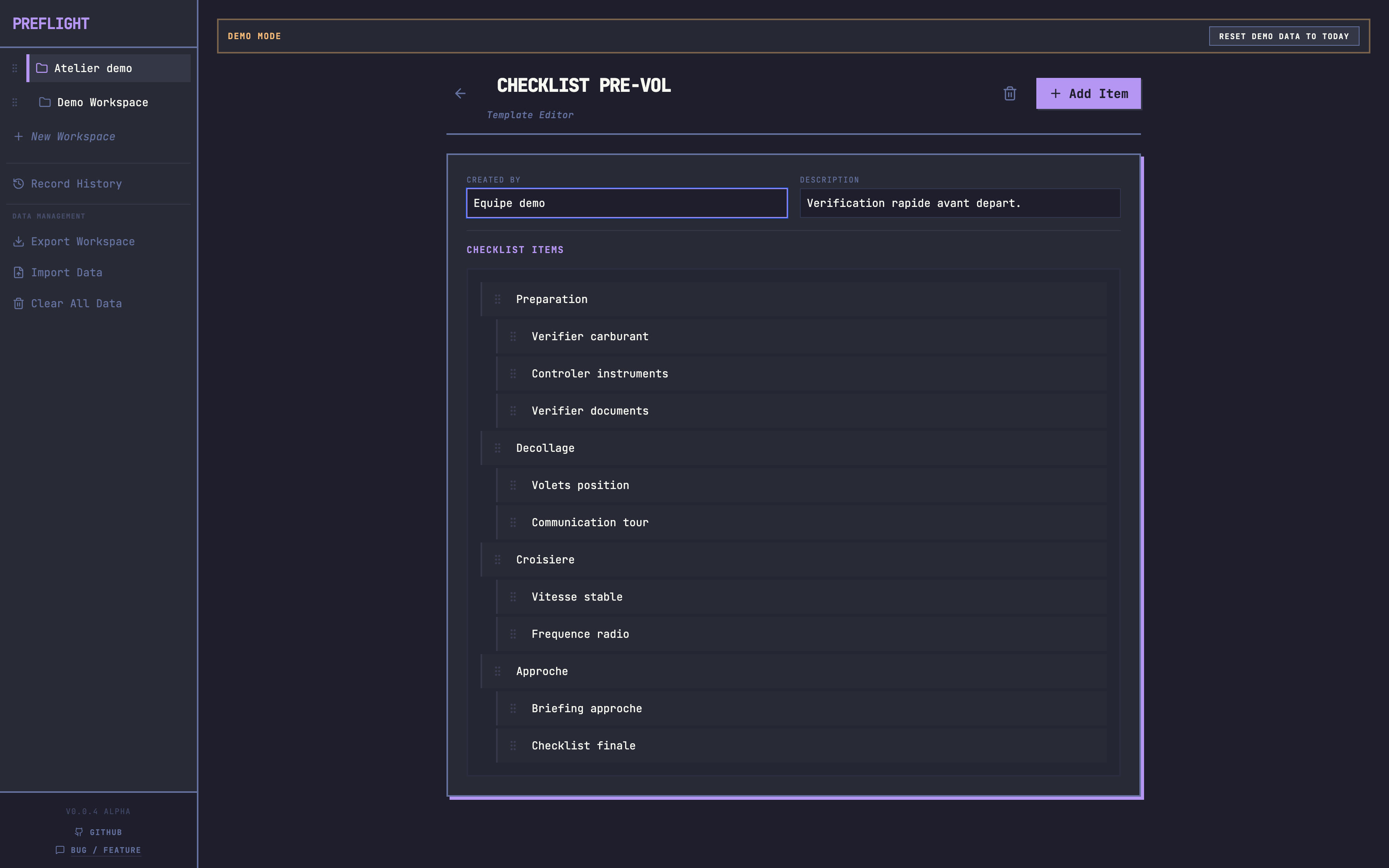 Vue d'exécution d'une checklist Preflight